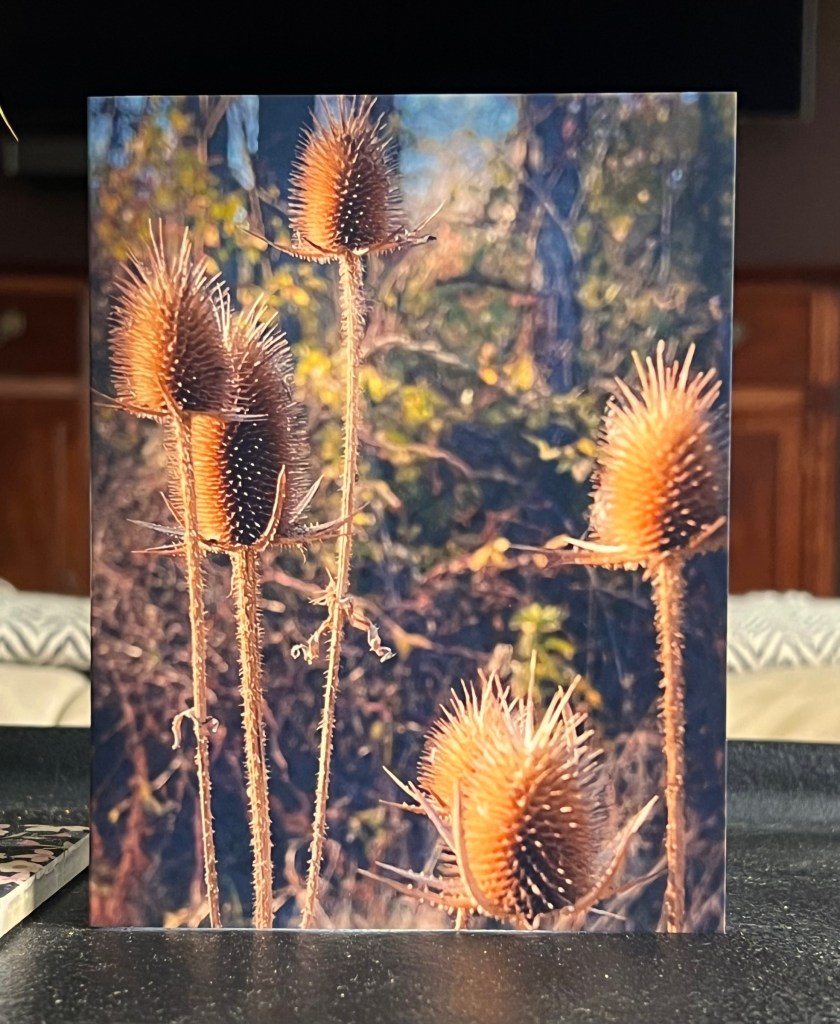 “Early Spring Sunrise”, pastel reproduction“Salmon Portualca”, photo“Backlit Sunflower”, pastel reproduction“Chives in Bloom”, photo“Hollyhocks in Bright Summer Sun”, detail from pastel reproduction “Wood Violet”, watercolor reproduction “Pear Blossoms”, photo“Common Teasel”, photo“Winter Contrast”, pastel reproduction “Springtime Bouquet”, detail from pastel reproduction “Horse Chestnut”, mixed media reproduction“Ash”, mixed media reproduction“Touch of Frost”, photo“First Crocus”, watercolor reproduction